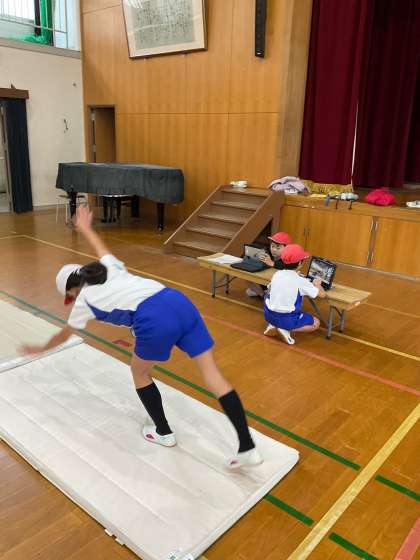 体育科では、マット運動に取り組んでいます。