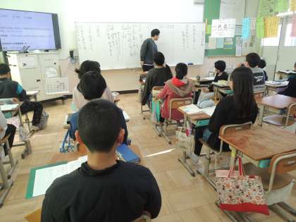 国語では年賀状の書き方を学びました。まずは宛名の書き方を自分で考えて書いてみました。初めて書く人や忘れてしまっている人も多く、いろいろな宛名の書き方が見られました。最後に正しい宛名の書き方を学び、間違えたところを訂正しました。次の時間は、実際にはがきに書く予定です。