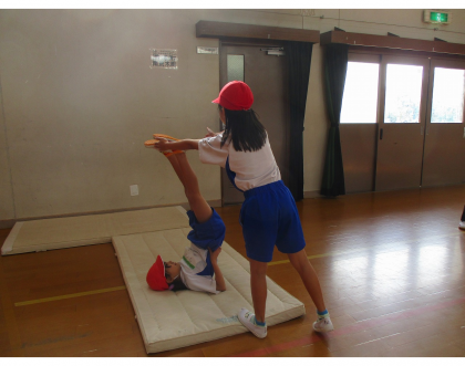 ねらい2では、できるようになった技をいろんなコースで楽しみました。コロコロ転がったり、ピョンピョン跳んだりして、楽しみながら活動をしていました。