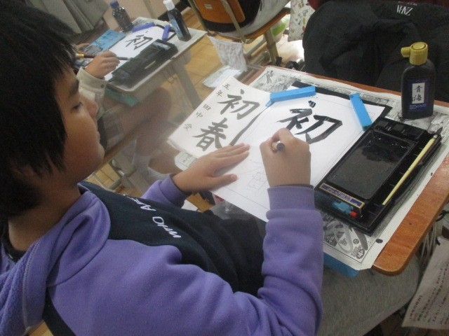 今日は全クラスで「初春」の習字をしました。