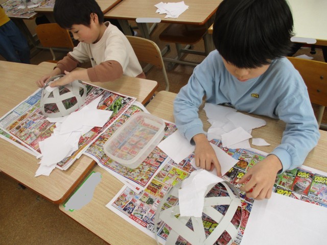厚紙の短冊で作った型に紙や新聞紙をのりで貼っていきます。