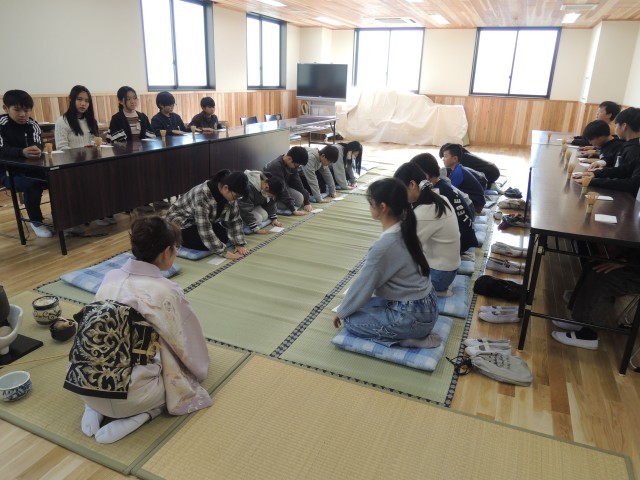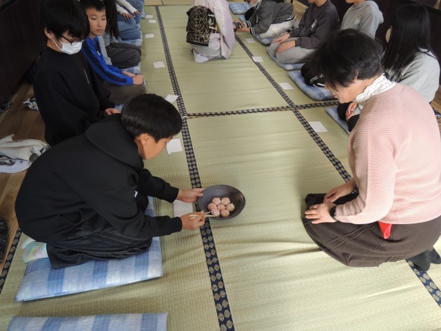 地域のお茶の先生に来ていただき、茶道について教えていただきました。お茶のたて方だけでなく、お辞儀の仕方やお箸の正しい持ち方など日常でも使える様々な作法を教えていただきました。甘くておいしい和菓子をいただいた後に、友達がたてたお茶を飲みました。お茶は子どもたちにはやはり少し苦かったようでしたが、貴重な経験となりました。