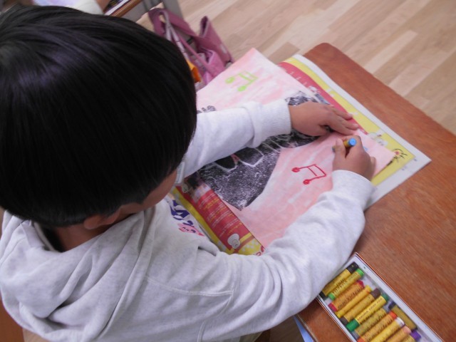 版画の背景をクレパスでかいています。