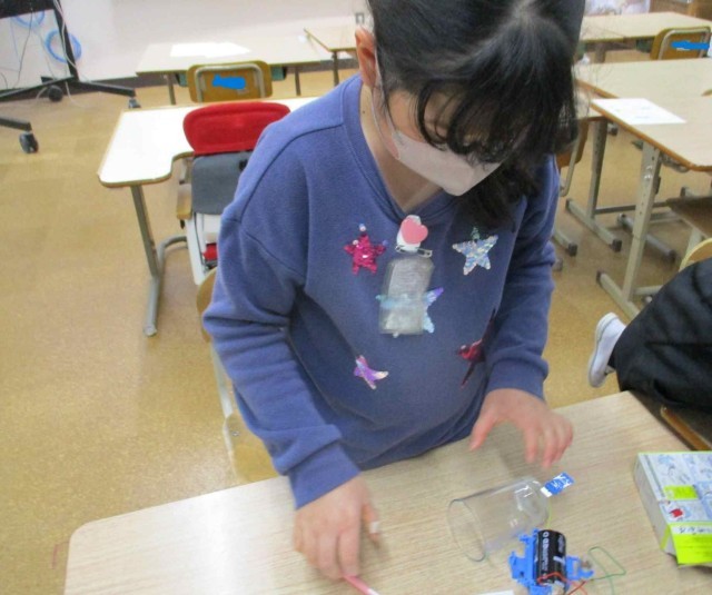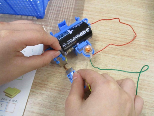 自分たちが作った回路を使って、「アルミニウムはく」「段ボール」「空き缶」「輪ゴム」「くぎ」など、いろいろなものを間に入れて電気が通るのかを実験をしました。