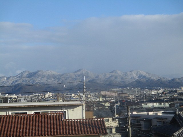 廊下の窓から外見ると、向こう側の山には雪が積もっていました。