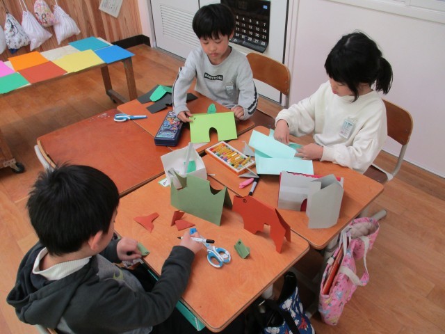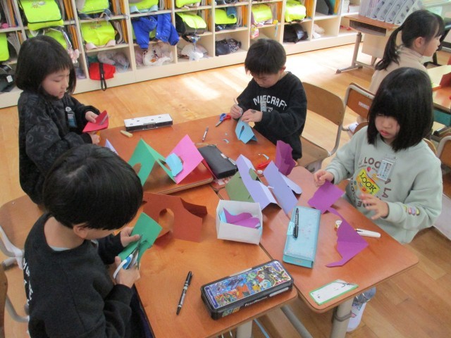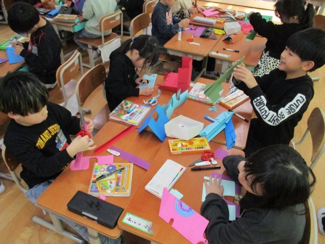 図画工作科の学習で、画用紙を折って立てて様々なものを作りました。
