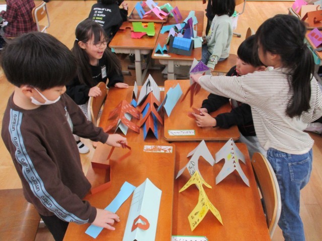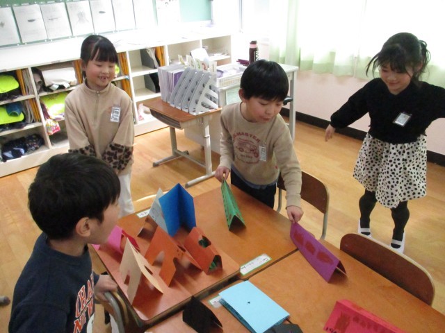完成した後に、作ったものをグループの友だちと見合って、グループごとに世界を作りました。
