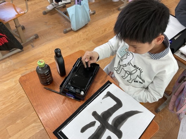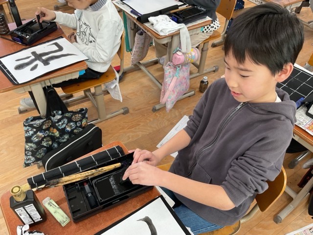 この日の書写は、以前より子どもたちから「いつかやってみたい!!」と熱望されていた、墨をすり、墨液を作るところから取り組みました。