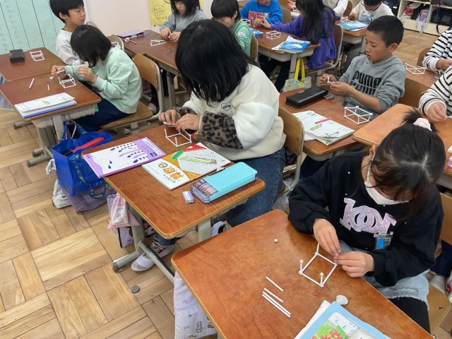 算数科「はこの形」の学習では、方眼紙やひご、ねん土玉を使ってはこの形を作っています。