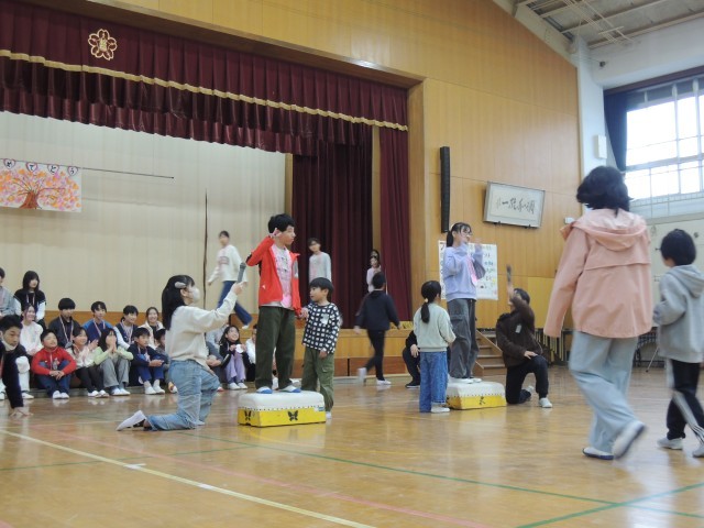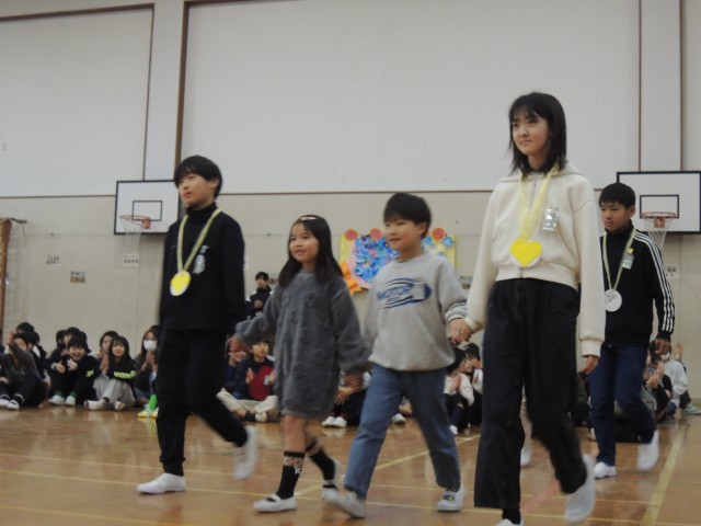 6年生を送る会では1年間ずっと交流をしてきたたてわりグループの1年生と入場しました。台の上では自分で決めたポーズを取り、一言ずつメッセージを述べました。