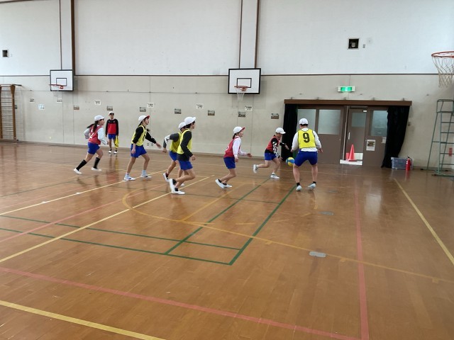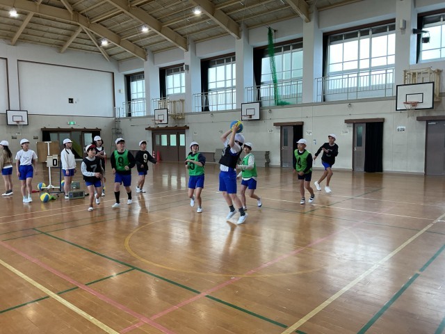 2組は体育で「バスケットボール」をしています。チームで協力してボールをつなぎゴールを狙っています。寒い時期の体育ですが、子どもたちは汗をかきながら楽しく取り組んでいます。