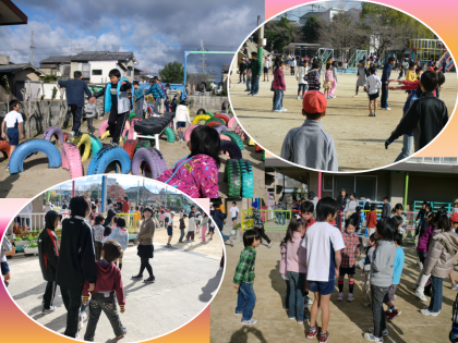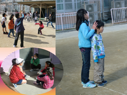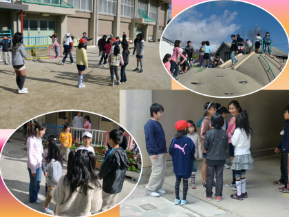 今日の中間休みは、1〜6年までの縦割りグループで遊ぶ『なかよしタイム』の時間でした。とってもいい天気の中で、みんな運動場で仲良く交流ができました。