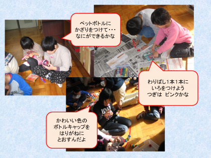 牛乳パックやペットボトル,わりばし,空き箱などを材料に・・・みんな とても熱心に作りました。何ができるかは…お楽しみ★