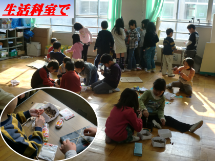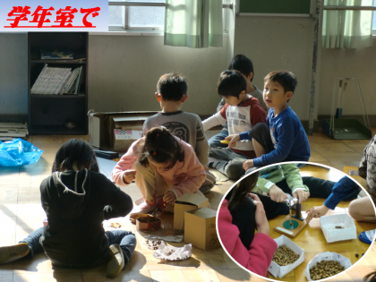 2年生は,嵐山東公園で秋見つけで拾ってきたどんぐりを使って、2月に”どんぐりフェスタ”を計画しています。1年生や保護者、地域の皆さんを招待して体育館でどんぐりを使ったフェスティバルが繰り広げられます。今日はその材料をもとにした遊び道具の製作などを楽しそうにしていました。