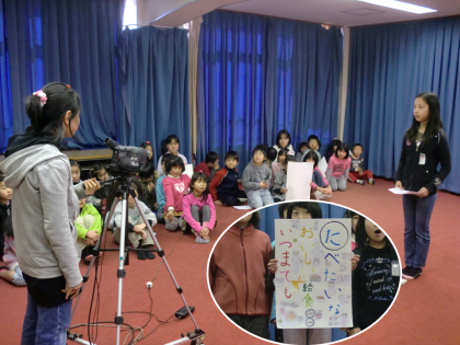 給食週間の取組みの一つで、各クラスで作成した”給食カルタ”があります。今日の給食時のテレビ放送で,低学年のカルタ発表がありました。