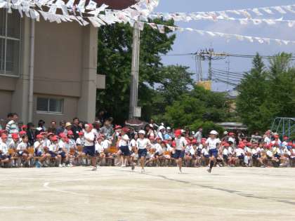 2年生「とびだせ冒険レンジャー」マントを翻し,がんばってダンスしました。続いては,5年生100メートル走,さすが高学年!力強い走りです。