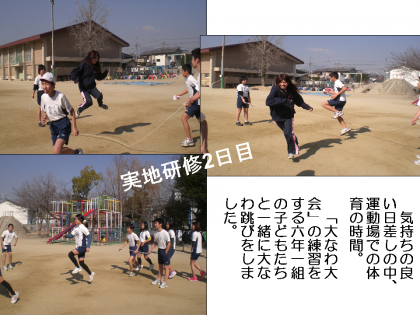 実地研修2日目の松井さん。今日の4時間目は6年1組の子どもたちと一緒に体育をしました。「大なわ大会」の練習で時間をはかって回数を数えました。日差しが暖かく汗びっしょりになりました。
