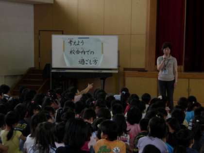 本日の朝礼では運動会のふりかえりと,6月の生活目標の確認,給食委員会からのお知らせがありました。
