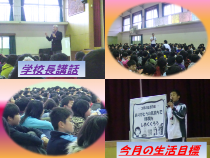 いよいよ本年度の最終月に入りました。6年生は卒業に向けて練習が始まります。他学年は本年度のまとめと次学年への自覚を高める月でもあります。学校長からは,そのような中にあって,気づいて頑張ることの大切さの話があり,生活目標の発表がありました。
