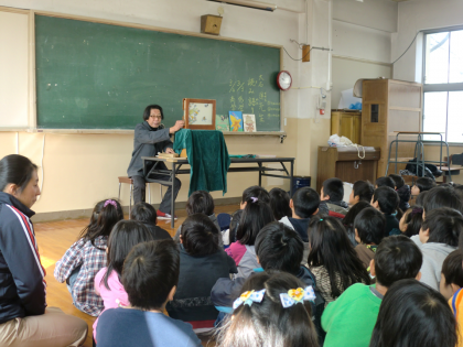今日,明日の2日間に渡って大石進先生による読み語りがあります。今日は,低学年で明日が高学年です。2校時にはプレイルームで1年生が熱心に聞き入っていました。