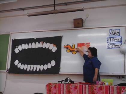 歯の模型を使って正しい歯のみがき方を教わりました。飲食後の歯垢がついた口内の写真も見せてもらい,子どもたちからは驚きの声があがっていました。給食後の歯みがきでも,教わったことを意識して歯をみがいている姿が印象的でした。