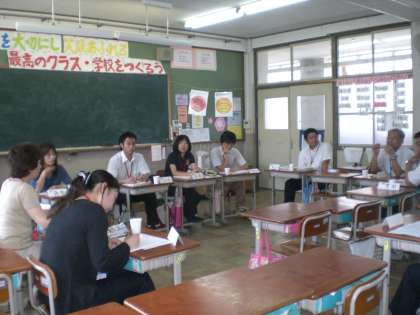 桂中学校から先生達を招いて,5校時全学級公開授業をしました。その後,低・中・高学年に分かれて,小中9年間の義務教育の中で,子どもたちをどのように育てていきたいかなど意見交流会を行いました。