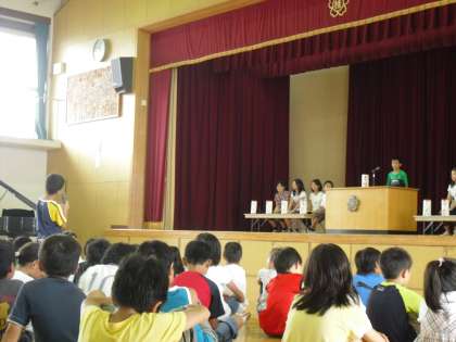 小雨のため低学年が予定していたプール学習はできませんでしたが,体育館では,全校での朝会・5年生の体力テスト・1年生の体育・3年生以上の児童総会と熱気のある活動が続きました。午後からも,子どもたちはがんばって学習に取り組みます。ぜひ,ご参観ください。