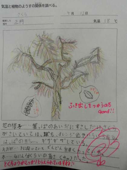 12日(月)は,「季節と生物」の学習をしました。校内で「春見つけ」と「さくらの木の観察」をしました。春見つけでは,春に見られる生物を興味をもって探していました。また,さくらの木の観察では,よく見て,特徴をしっかりととらえていました。