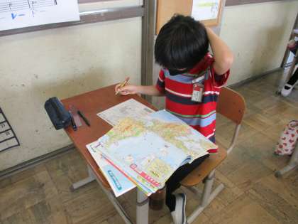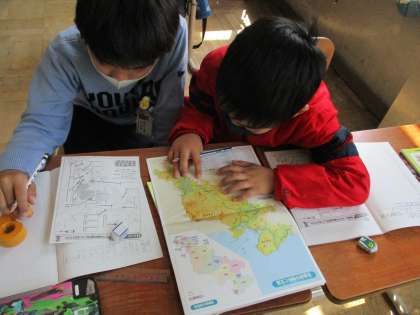 社会科の学習では,京都府の地形を地図帳を使って調べました。川や山,高地や盆地などを地図から見つけることができました。子どもたちのよく知っている桂川を見つけて喜んでいる姿もありました。