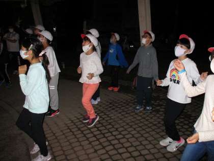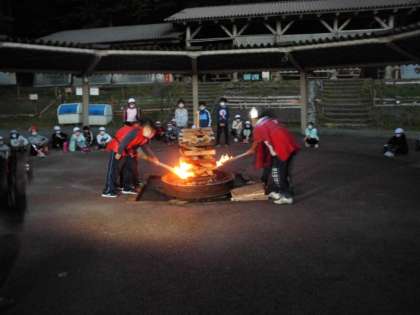 レクリエーション係がキャンプファイヤーの準備を整えてみんなを待ちます。みんなが揃った頃,日も暮れてきました。火の神様(校長先生)から「Plus1」の火をもらって,火の子たちが協力して点火しました。そして,みんなでゲームやダンスを踊って盛り上がりました。