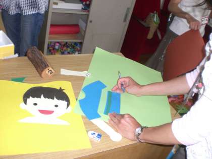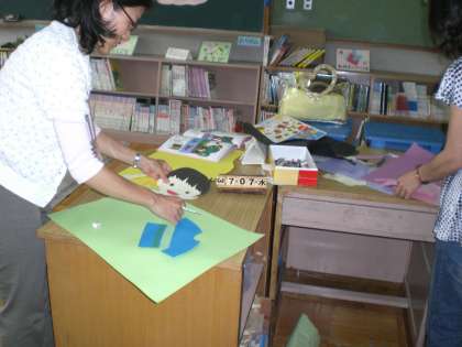 今日(7/8)は,図書ボランティア”ぱれっと”さんの今月の定例会です。秋の公演に向けた打ち合わせなどのあと,第2図書室の壁面掲示物を作っていただきました。