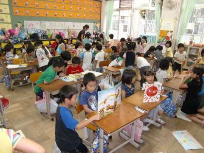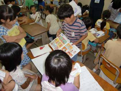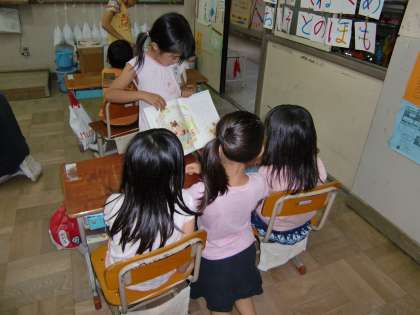 今日(7/10)の朝の時間に,2年生が1年生の教室に出向いて読み聞かせをしました。2年生も自分で選んだ本をもってきて上手に読んでおり,1年生も真剣に2年生の読み聞かせを聞いていました。