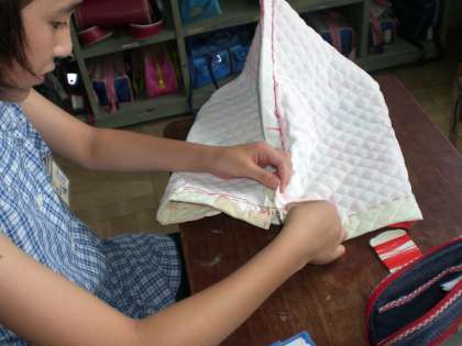 来月下旬から9月にかけて4,5年が「みさきの家」に行きますが,いま5年生では家庭科の時間に,その野外活動で利用するナップサックの製作に取りかかっています。慣れない手つきですが,みんな上手に作っていました。