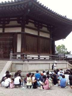 奈良も気温がぐんぐん上昇してきました。法隆寺夢殿の前でひと休みです。このあと,奈良公園で昼食となります。少々バテ気味です。