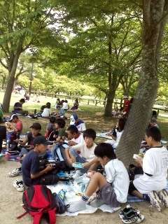 やっとお昼のお弁当です。暑いので日陰で食べていますが,そこに鹿が・・・。