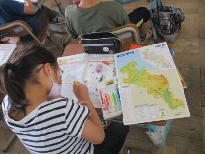 今日は,京都の地形について学習しました。土地の高さごとに色を塗って,京都府の中でも土地の高さは異なることを学びました。「京都市は,山で囲まれているから盆地。」であることに気づく子もいて,びっくりしました。色塗りも丁寧かつ素早くて,さすが4年生でした。