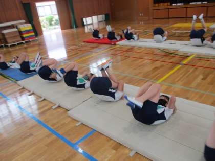 〇〇の連続ということで前転や後転の練習をしたり,自分のできる技を増やそうということで,開脚前転やロンダード,倒立前転などに取り組んでいます。先生のアドバイスのおかげで,「できるようなった。」という声もたくさん聞こえました。