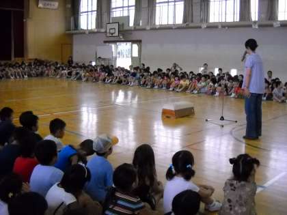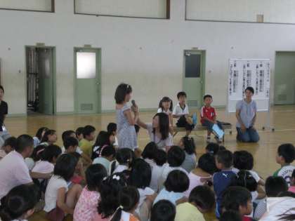 身の回りの出来事で,感動したことや気付いたことなどを自分の言葉で全校児童の前で発表します。その発表について聞いている全校児童との意見交流が始まります。このような双方向の意見交流やコミュニケーション力の育成に桂小は力を注いでいます。聞くみんなも真剣です。