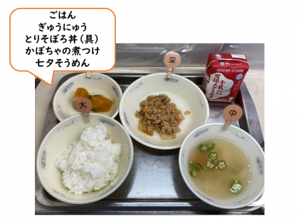 ☆七夕の行事献立です。七夕そうめんは,天の川に見立てた「そうめん」と星に見立てた「おくら」を入れて作りました。