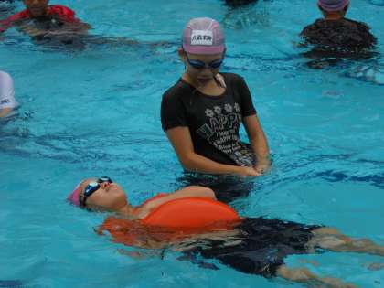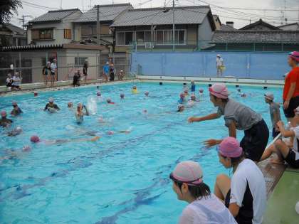 6年生がプール学習の締めくくりとして着衣水泳をしました。「服を着て泳ぐと重くて泳ぎにくいよ」「お腹の所に空気を入れると浮きやすいね。」おぼれている人にペットボトルを投げ入れてあげたり,袋に空気を入れて浮き輪代わりにしたり救助の仕方も実践してみました。