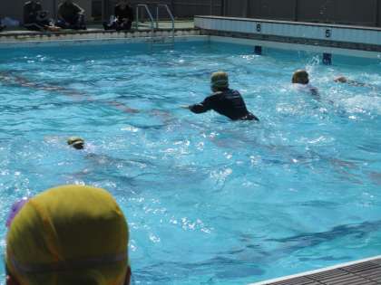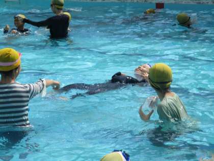 6年生最後の水泳学習では、着衣泳をしました。服を着たまま泳ぐことで、体が重くなりいつものように泳げないことを経験しました。また、事故に遭い水の中で救助を待つことを想定し、ペットボトルや服を利用して、浮いて待つ方法を考えました。