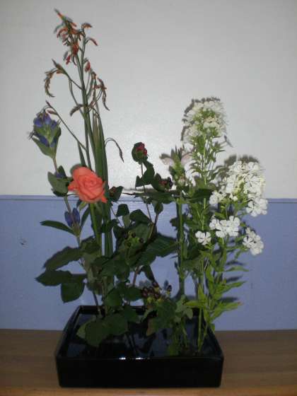 (写真下)保健室横のトイレ入口前には,前田養護教諭の力作が生けてあります。花材は姫日扇,リンドウ,フロックスです。