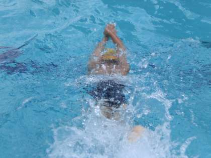 (写真上)プールサイドでバタ足の練習を一生懸命 ⇒ (写真中)次には,ビート板を使ってプールサイドまでバタ足で行きます ⇒ (写真下)こんなにきれいに泳げるようになりました。手も体もきれいに伸びて「伏し浮き」ができています。このあとバタ足で向こう岸まで行きました。
