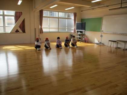 バランスボールに乗って跳ねたり、ボールの上に座ったりうつ伏せで飛行機ポーズをとったりして体幹を鍛える学習です。