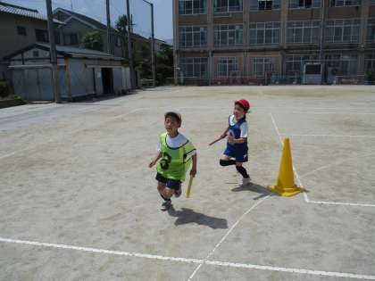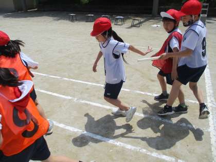 三年生からは、バトンが変わるということでバトンの渡し方や受け取り方を確認しました。子ども達の一生懸命走る姿が印象的でした。