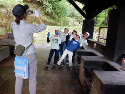 班ごとに火起こし体験をしました。時間がかかり手こずっている班もありましたが、最終的に全部の班が成功しました。この火を使って次は野外炊事です。