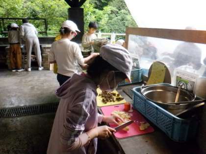今日の夕食は班ごとに作るカレーライスです。係を分担して協力しながら頑張っていました。