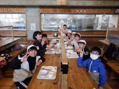朝のつどいの後は食堂で朝食を摂ります。ごはんまたは食パン、コンソメスープまたは味噌汁を選んで、おかずはバイキングです。食器の返却もスムーズにできていました。