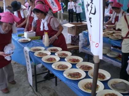 (写真上)お好み焼き(社会福祉協議会) (写真中・下)たこ焼き(女性会)