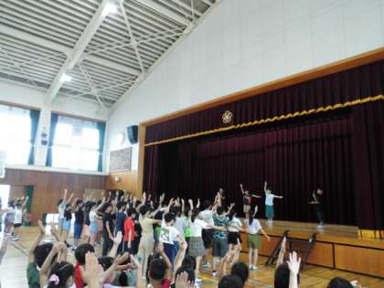 はじめに全校で校歌を歌いました。そして、リズム遊びをしました。